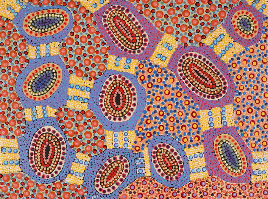 Jennifer Napaljarri Lewis paints for the Warlukurlangu Artists Aboriginal Corporation located at the Yuendumu community 300km north-west of Alice Springs in the Northern Territory of Australia. Established in 1985, Warlukurlangu Artists Aboriginal Corporation is a fully Aboriginal owned and governed art centre with over 600 members. One hundred percent of the proceeds from the sale of all art works go directly back to the artists and their community projects.