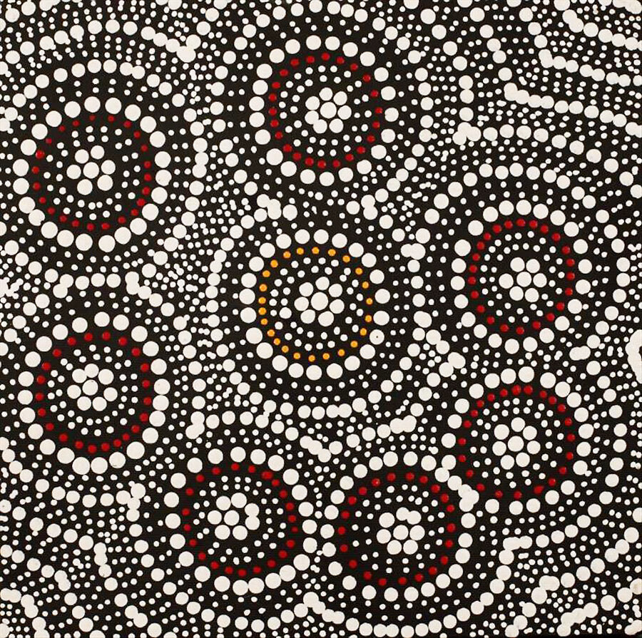 Justinna Napaljarri Sims paints for the Warlukurlangu Artists Aboriginal Corporation located at the Yuendumu community 300km north-west of Alice Springs in the Northern Territory of Australia. Established in 1985, Warlukurlangu Artists Aboriginal Corporation is a fully Aboriginal owned and governed art centre with over 600 members. One hundred percent of the proceeds from the sale of all art works go directly back to the artists and their community projects.