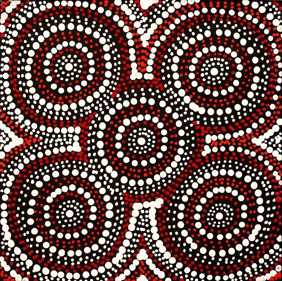 Justinna Napaljarri Sims paints for the Warlukurlangu Artists Aboriginal Corporation located at the Yuendumu community 300km north-west of Alice Springs in the Northern Territory of Australia. Established in 1985, Warlukurlangu Artists Aboriginal Corporation is a fully Aboriginal owned and governed art centre with over 600 members. One hundred percent of the proceeds from the sale of all art works go directly back to the artists and their community projects.