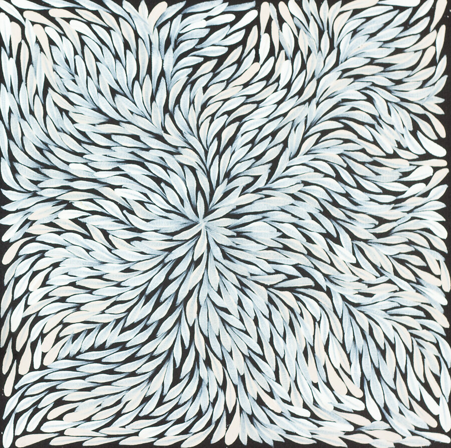 This painting depicts leaves of a special plant that are used for medical purposes. Women go to different places around her country, Utopia, to collect such leaves. Once selected the leaves are boiled to extract resin and kangaroo fat is mixed through creating a paste that can be stored in the bush for extended periods. The medicine is used to heal cuts, bites, burns, rashes and also acts as an insect repellant.
