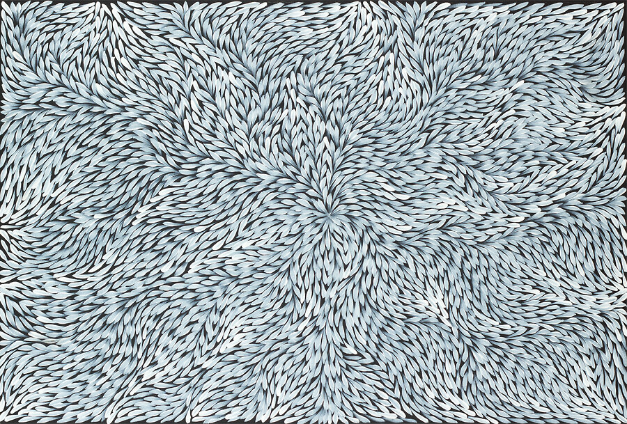 This painting depicts leaves of a special plant that are used for medical purposes. Women go to different places around her country, Utopia, to collect such leaves. Once selected the leaves are boiled to extract resin and kangaroo fat is mixed through creating a paste that can be stored in the bush for extended periods. The medicine is used to heal cuts, bites, burns, rashes and also acts as an insect repellant.