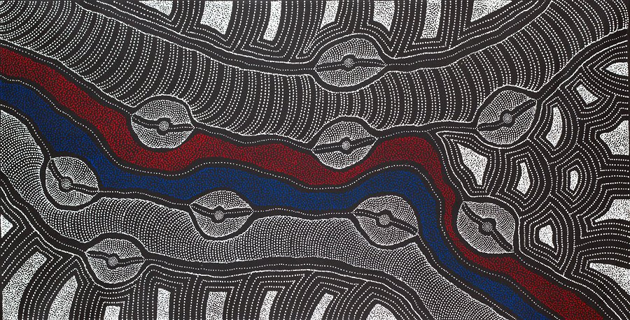 In this painting Delvine has focused on images of her ancestral country, the finely delineated structures showing the terrain of the sandhill and bush country, often with markings that reveal waterholes and ceremonial sites.