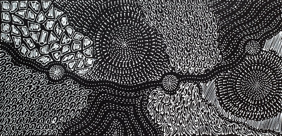 In this painting Freda has depicted the area of her birthplace. There are various campsites and ceremonial sites depicted with people often represented by U shapes. Also depicted are rock-holes, rocky outcrops and sand hills found in her homeland