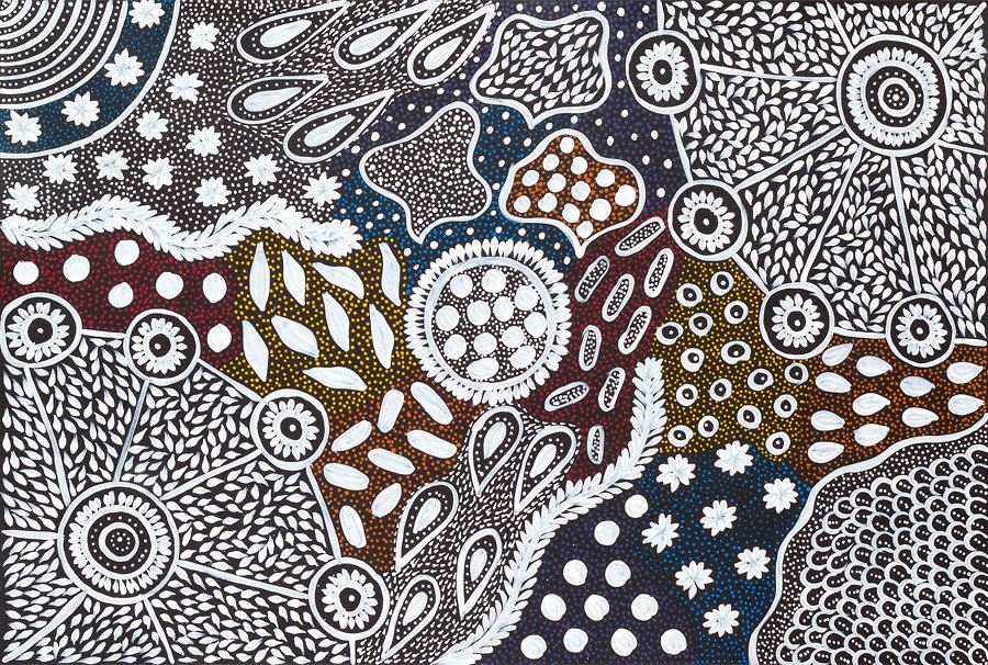 In this painting Naomi is paying homage to the bush yam which has been an abundant food and water source for her people for many generations. The bush yam is found in the area of the artists birthplace. An important part of the woman's role in traditional Aboriginal culture is to collect bush foods. The Yams are collected by digging deep into the soil using sharp digging utensils either made from carved wood or more commonly today, a metal crow bar. The yams are exposed amongst the root system of the yam bush. She has also painted bush leaves that are collected and used for medicinal purposes.