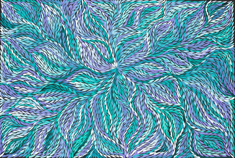 This painting depicts leaves of a special plant that are used for medical purposes. Women go to different places around her country, Utopia, to collect such leaves. Once selected the leaves are boiled to extract resin and kangaroo fat is mixed through creating a paste that can be stored in the bush for extended periods. The medicine is used to heal cuts, bites, burns, rashes and also acts as an insect repellant.