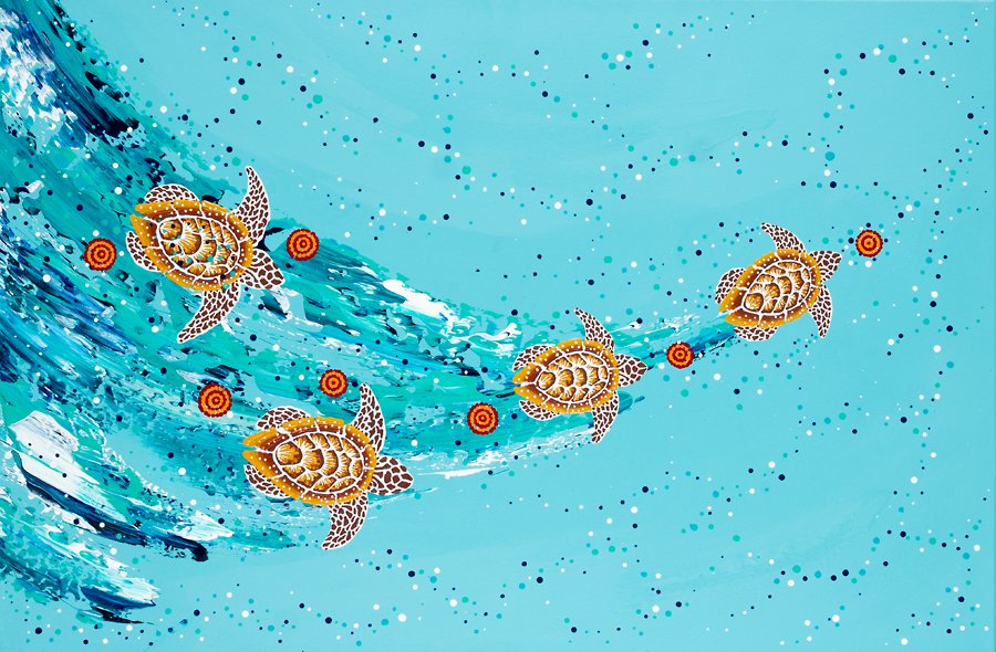 This artwork depicts the Seven Sisters, also known as the Pleiades star cluster, guiding turtles into shore at Mon Repos to lay their eggs.