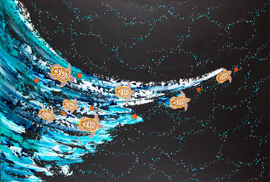 This artwork depicts the Seven Sisters, also known as the Pleiades star cluster, guiding turtles into shore at Mon Repos to lay their eggs.