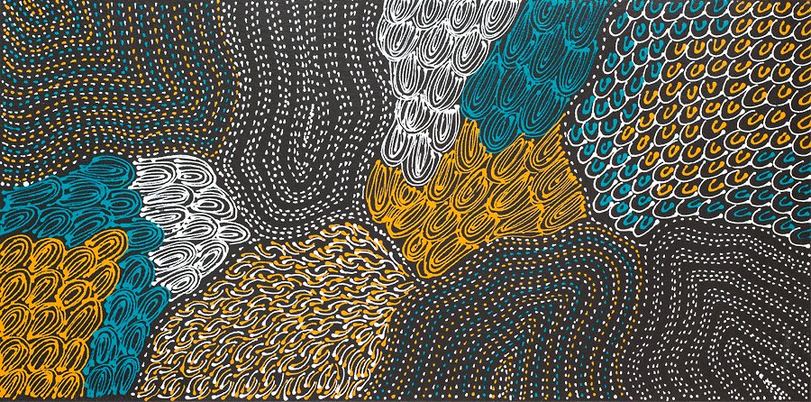 Her style is similar to that of her mother Anna with intricate dot work telling the story of her country in her sandhills style and has a great flare for colour as used in her Bush Yam style. Her Grandmother, the late Gloria (Glory) Ngale, was known for her eye for colour, a legacy of her Batik work, which she passed down to her daughters and granddaughters.