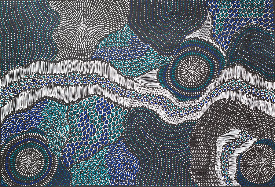 In this painting Freda has depicted the area of her birthplace. There are various campsites and ceremonial sites depicted with people often represented by U shapes. Also depicted are rock-holes, rocky outcrops and sand hills found in her homeland