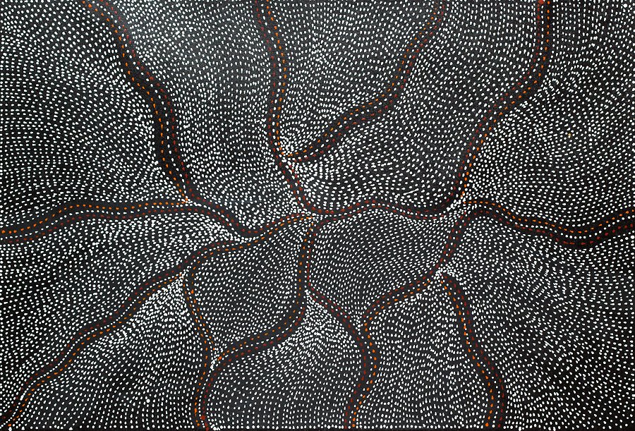 Her style is similar to that of her mother Anna with intricate dot work telling the story of her country in her sandhills style and has a great flare for colour as used in her Bush Yam style. Her Grandmother, the late Gloria (Glory) Ngale, was known for her eye for colour, a legacy of her Batik work, which she passed down to her daughters and granddaughters.