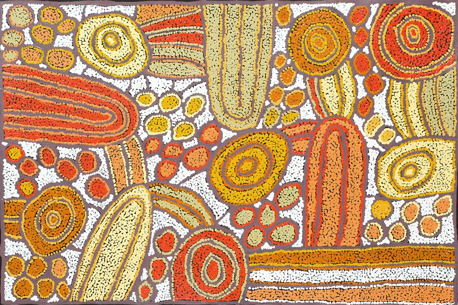 This vibrant design depicts a sacred rockhole site at Tjintjin Tjintjin which is a sacred women's ceremonial area surrounded by Tali (sand hills)