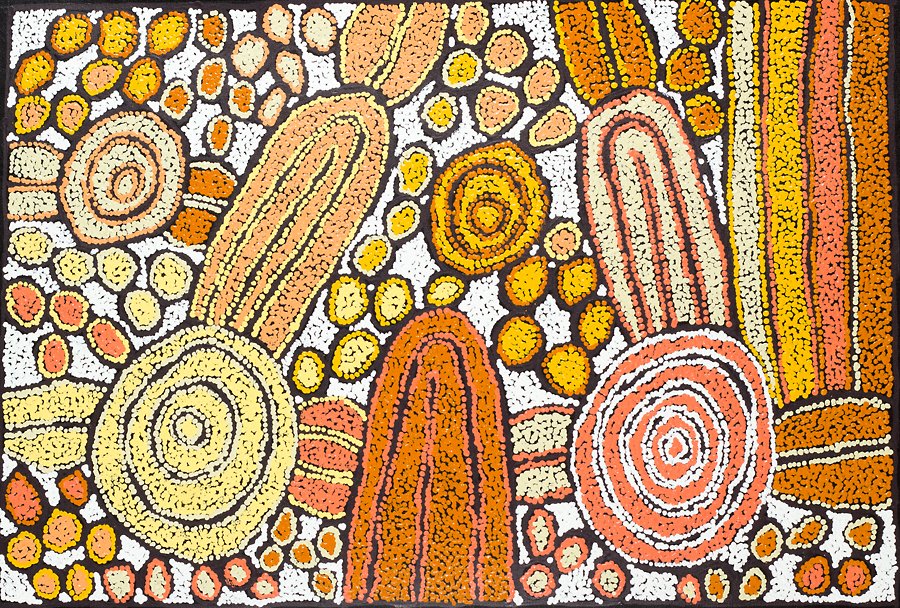 This vibrant design depicts a sacred rockhole site at Tjintjin Tjintjin which is a sacred women's ceremonial area surrounded by Tali (sand hills)