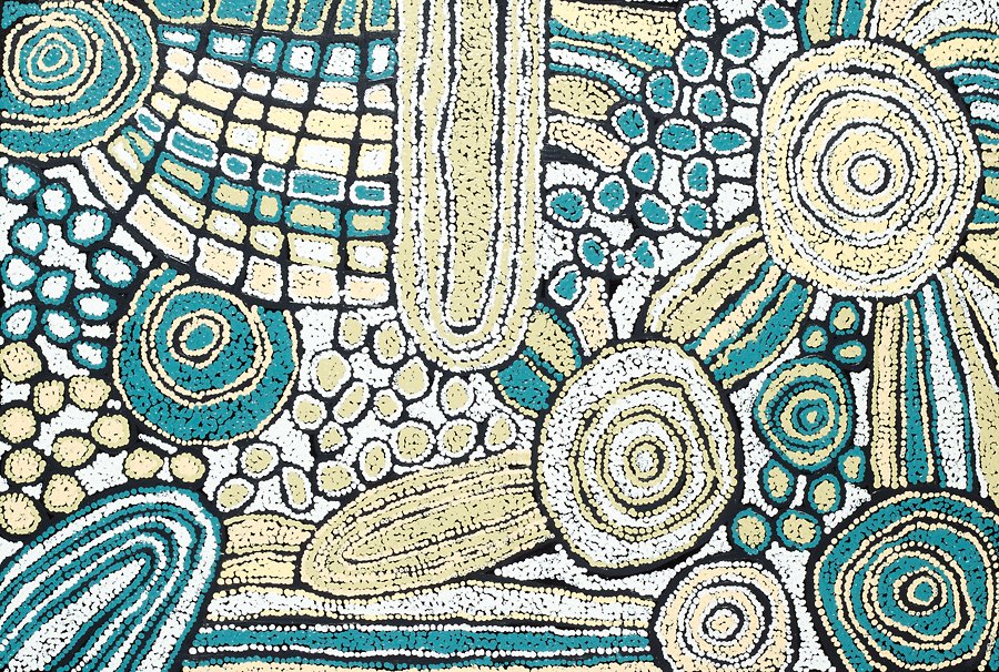 This vibrant design depicts a sacred rockhole site at Tjintjin Tjintjin which is a sacred women's ceremonial area surrounded by Tali (sand hills)