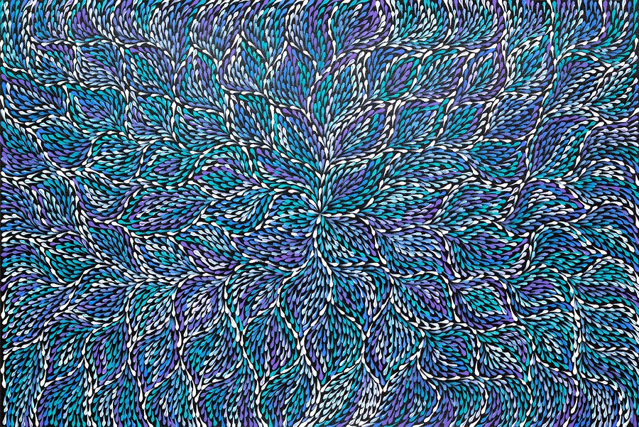 This painting depicts leaves of a special plant that are used for medical purposes. Women go to different places around her country, Utopia, to collect such leaves.Once selected the leaves are boiled to extract resin and kangaroo fat is mixed through creating a paste that can be stored in the bush for extended periods. The medicine is used to heal cuts, bites, burns, rashes and also acts as an insect repellant.