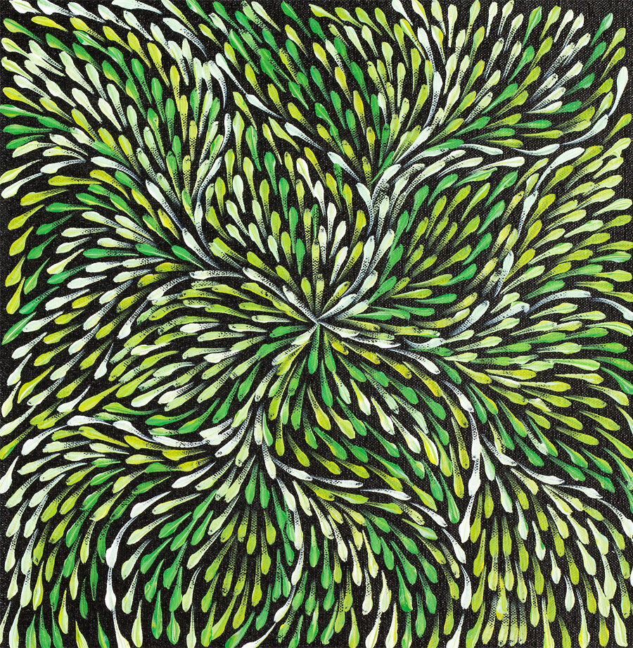 This painting depicts leaves of a special plant that are used for medical purposes. Women go to different places around her country, Utopia, to collect such leaves.Once selected the leaves are boiled to extract resin and kangaroo fat is mixed through creating a paste that can be stored in the bush for extended periods. The medicine is used to heal cuts, bites, burns, rashes and also acts as an insect repellant.