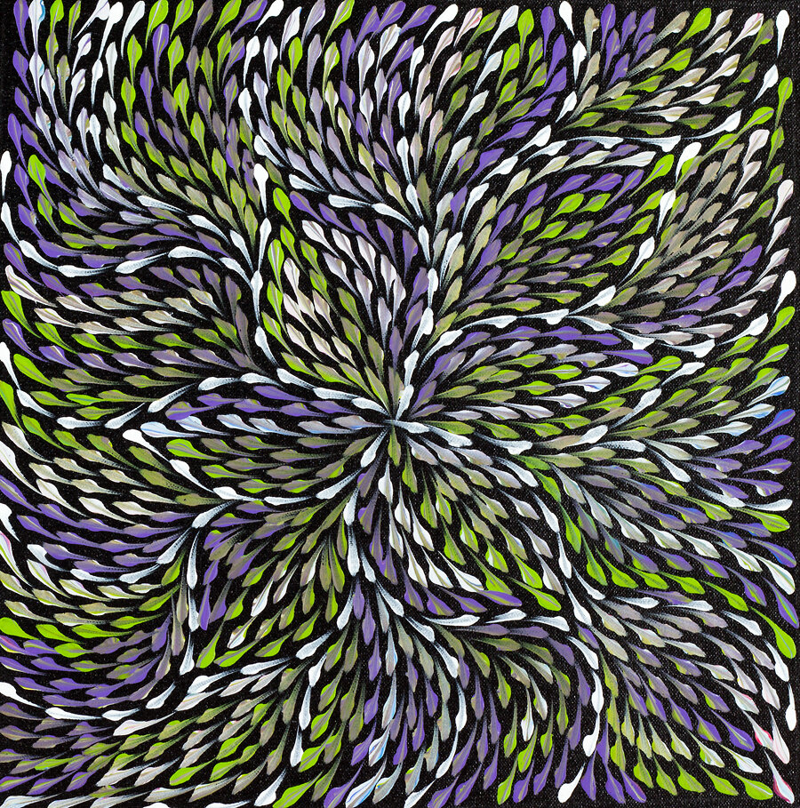 This painting depicts leaves of a special plant that are used for medical purposes. Women go to different places around her country, Utopia, to collect such leaves.Once selected the leaves are boiled to extract resin and kangaroo fat is mixed through creating a paste that can be stored in the bush for extended periods. The medicine is used to heal cuts, bites, burns, rashes and also acts as an insect repellant.