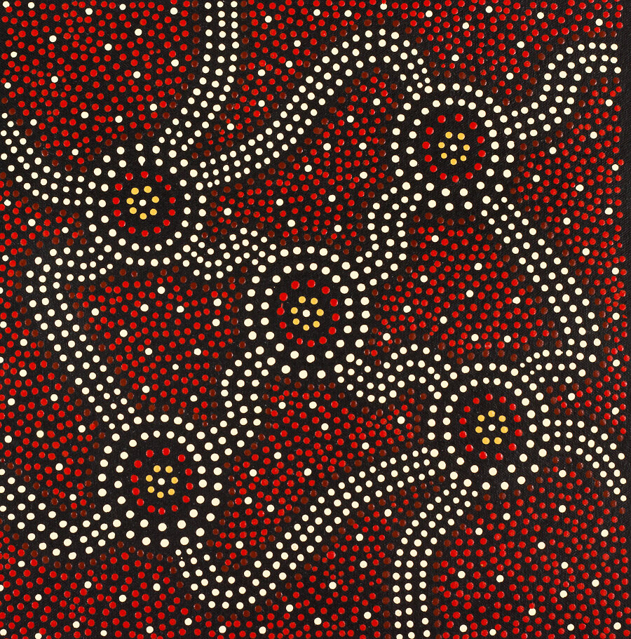 This painting shows his country, the Bundjalung Nation, with the coastal and inland Aboriginal communities. The circles represent family groups and clans with tracks that show their connection to other Aboriginal groups within his nation.